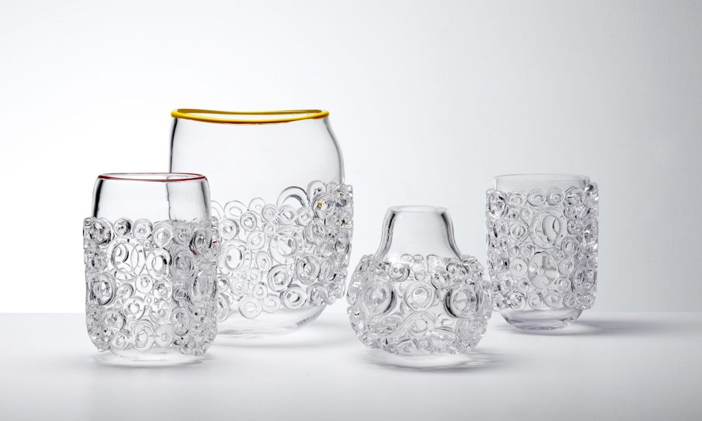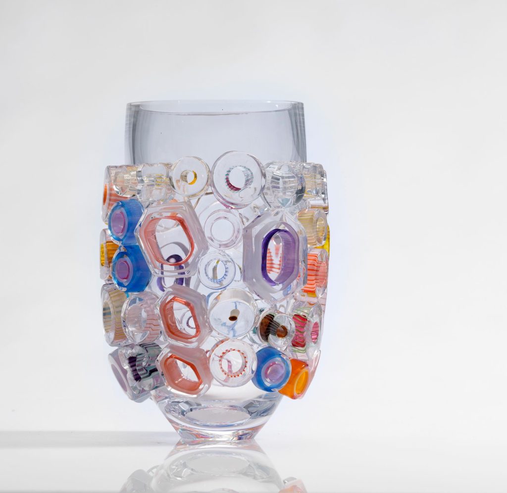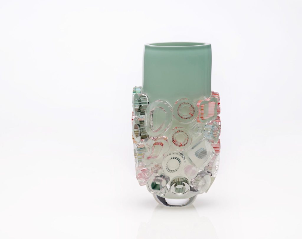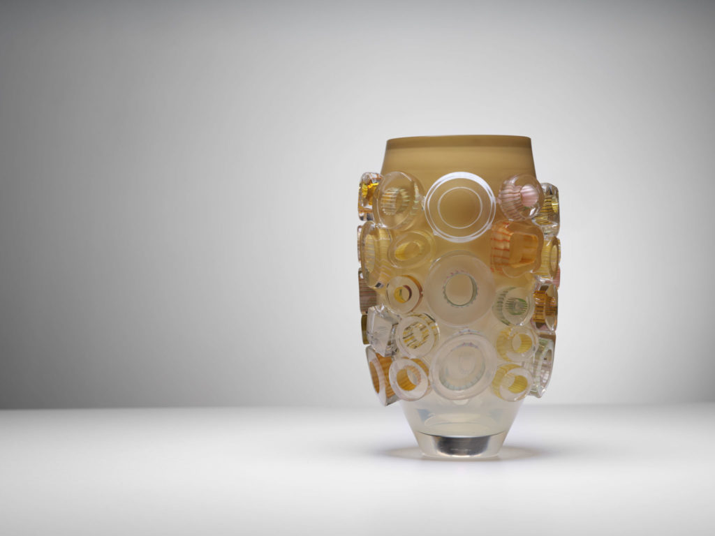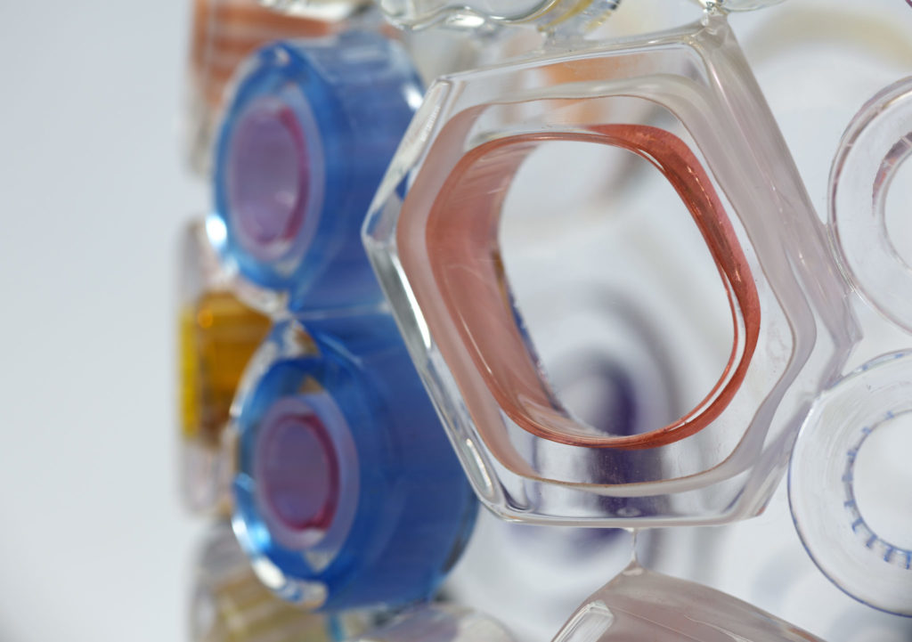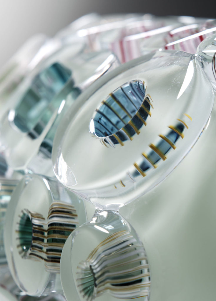 In this series the Tube Field is less rigidly organized but very expressive with the composition of colours. ‘There is always something negative going on in the world, I try to free myself by drawing from the positive.’ The fields created are reminiscent of the work in the murrini technique showing how Lintzen manages to turn liquid chaos into structure and patterns. In the Bright Tubes communication plays an important role again.